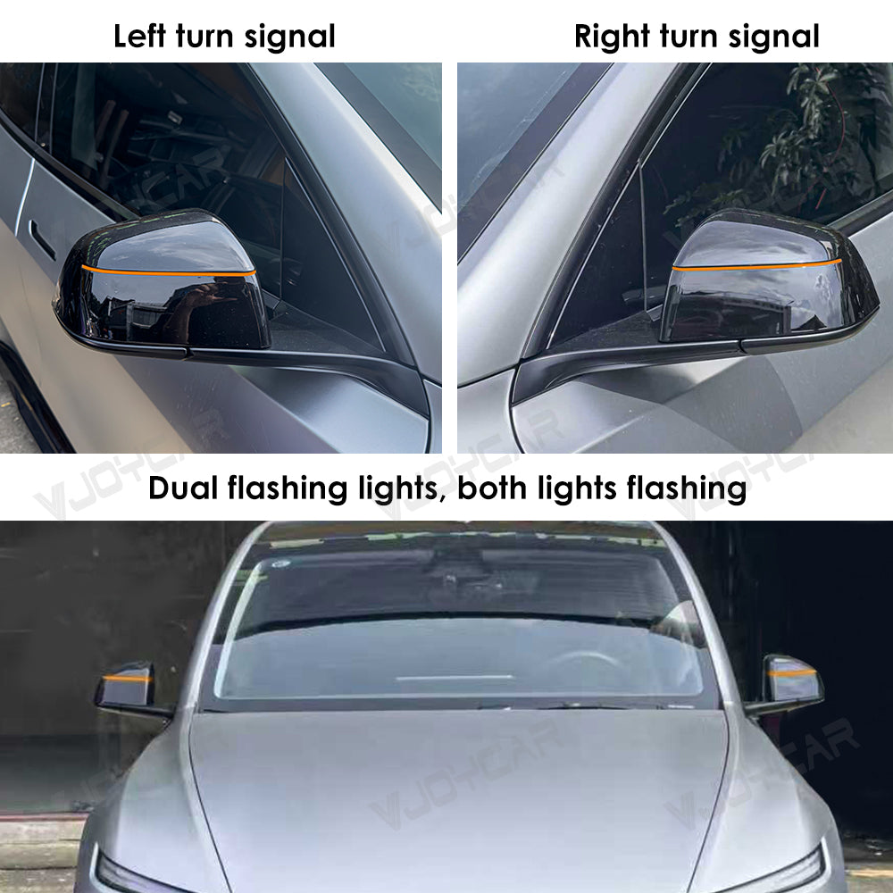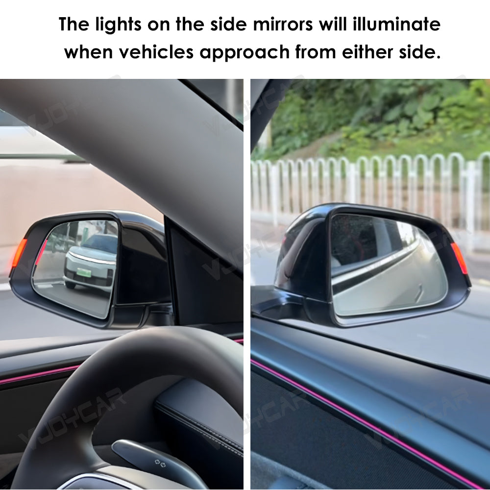 Smart Rear View Mirror Blue Light for Tesla Model Y and Model Y Juniper 2025+, when Tesla is under Full Self-Driving FSD mode or Enhanced Autopilot Driving AP model, the two sides smart rearview mirror blue light will be on. When detect Tesla blind spot is working, the triangle in the rearview mirror will be red also.