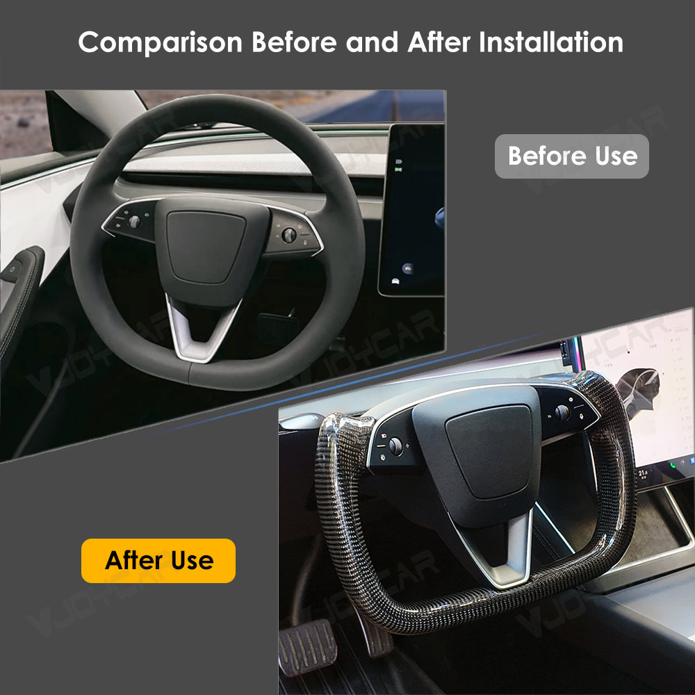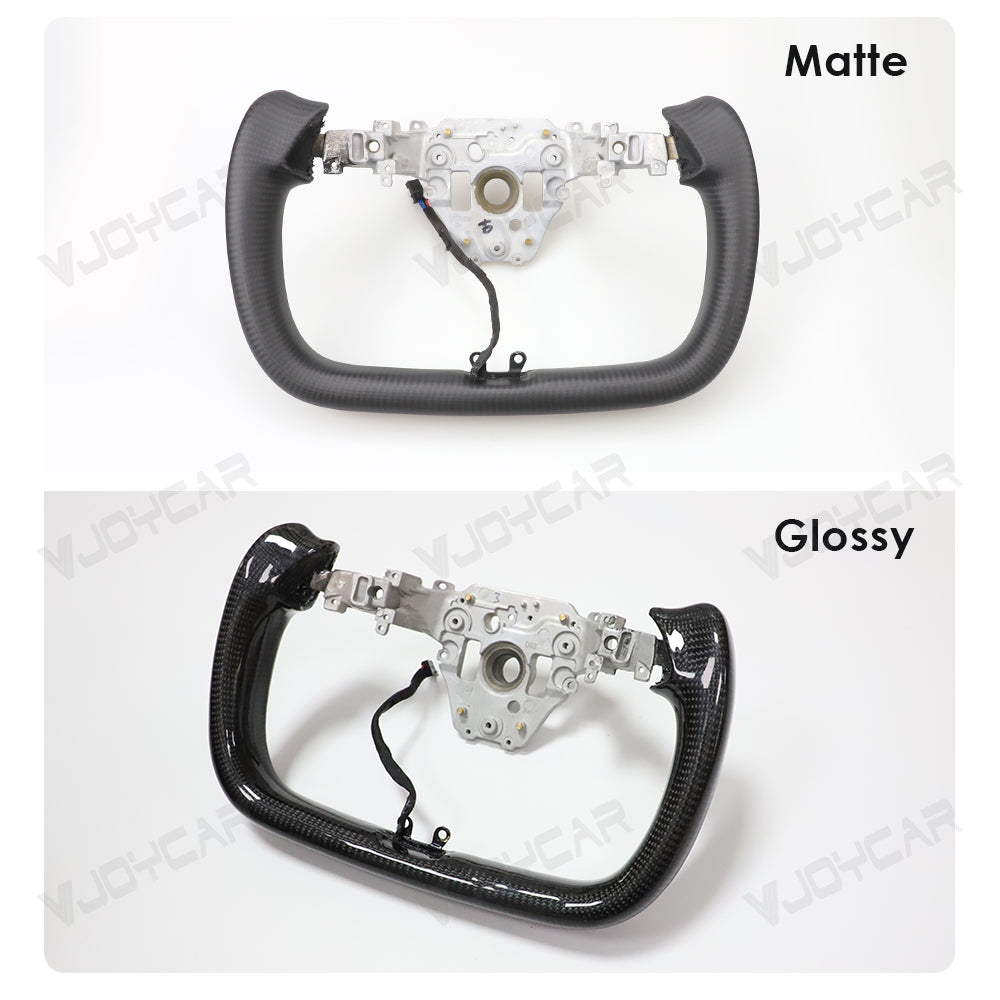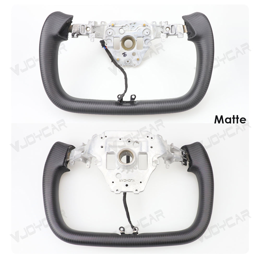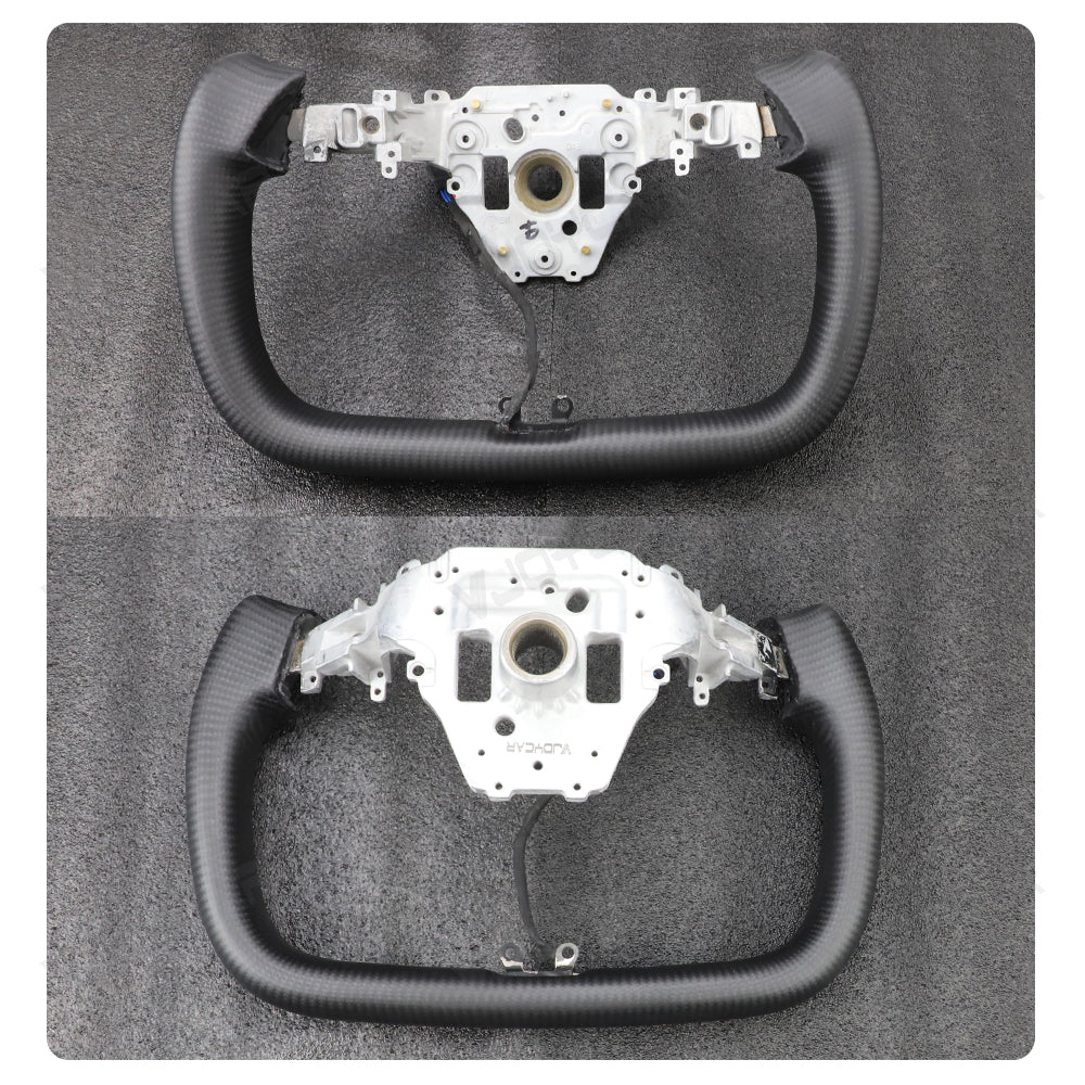 Real Dry Carbon Fiber Yoke Steering Wheel Handle for Tesla Model Y Juniper 2025+ with Heating 350mm diameter. Inspired by the yoke-style steering wheels of the Model X and Model S Plaid. The Ellipse shape design has a sense of sports vision as a whole to improve the vision of the road and to elevate your driving pleasure.
