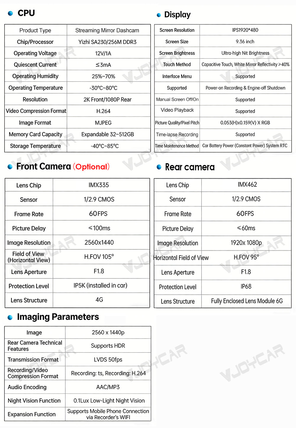 Japan Imported IMX 462 CMOS High-definition night vision rear camera and IMX335 front camera. Chipset 462+332 are the best partner after so many year testing and improvement, it ensure review mirror the best quality and lifetime when hot summer and cold winter.